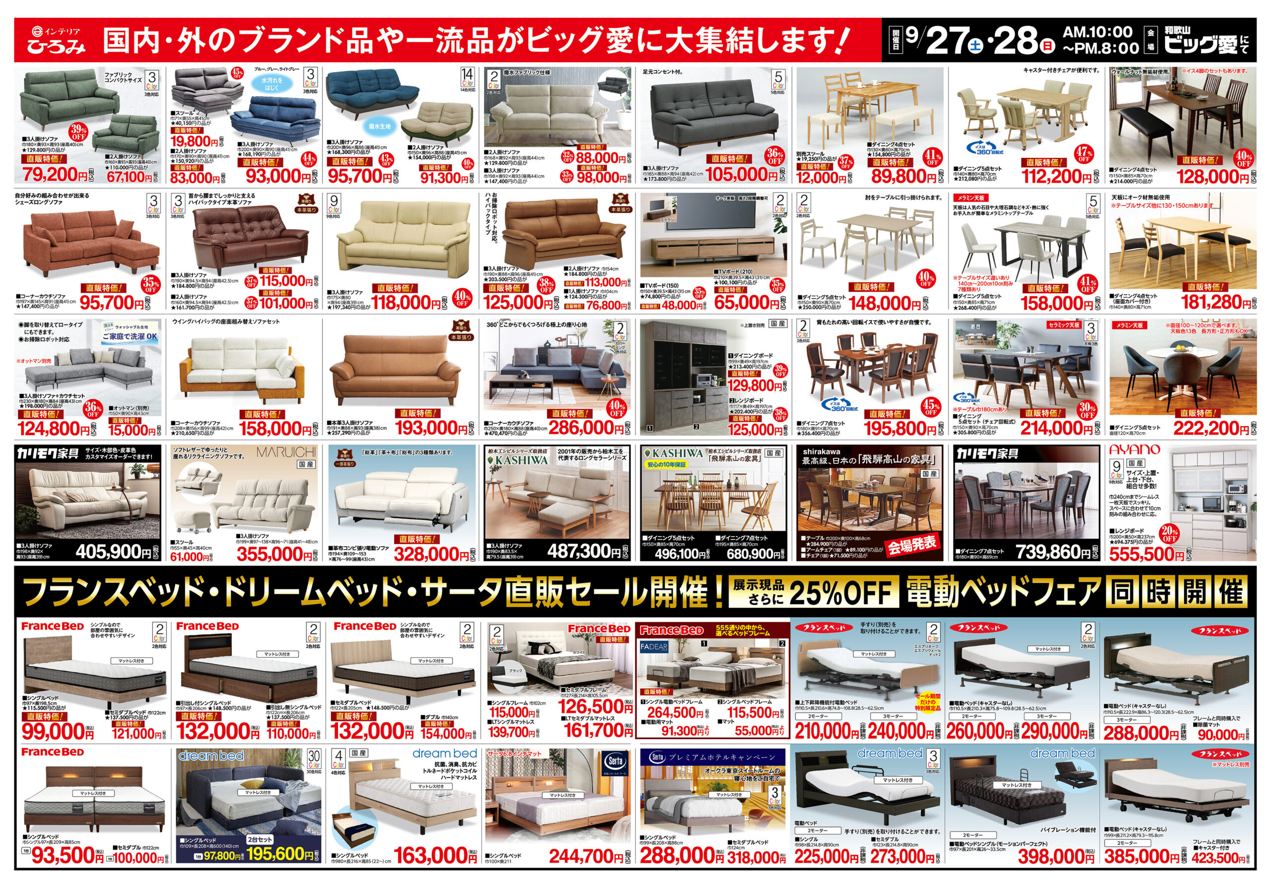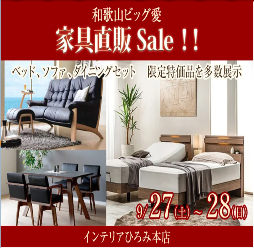 9月27日(土)28日(日)の2日間、和歌山ビッグ愛にて家具直販セールを開催いたします。
