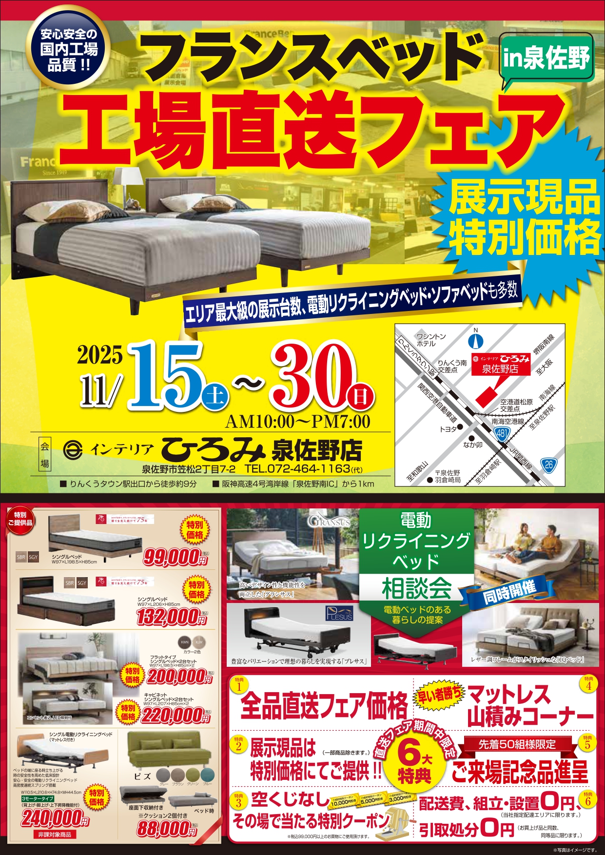 フランスベッド工場直送フェア in 泉佐野 11月15日(土)から30日(日)まで インテリアひろみ泉佐野店 3階特設会場にて フランスベッド工場直送フェア in 泉佐野を開催いたします。 安心安全のフランスベッド国内工場で生産された商品を 最大50%~20%OFFにてご用意いたしております! 数に限りがございます、お早目のご来店をお待ちしております。 2025.10.31 戻る