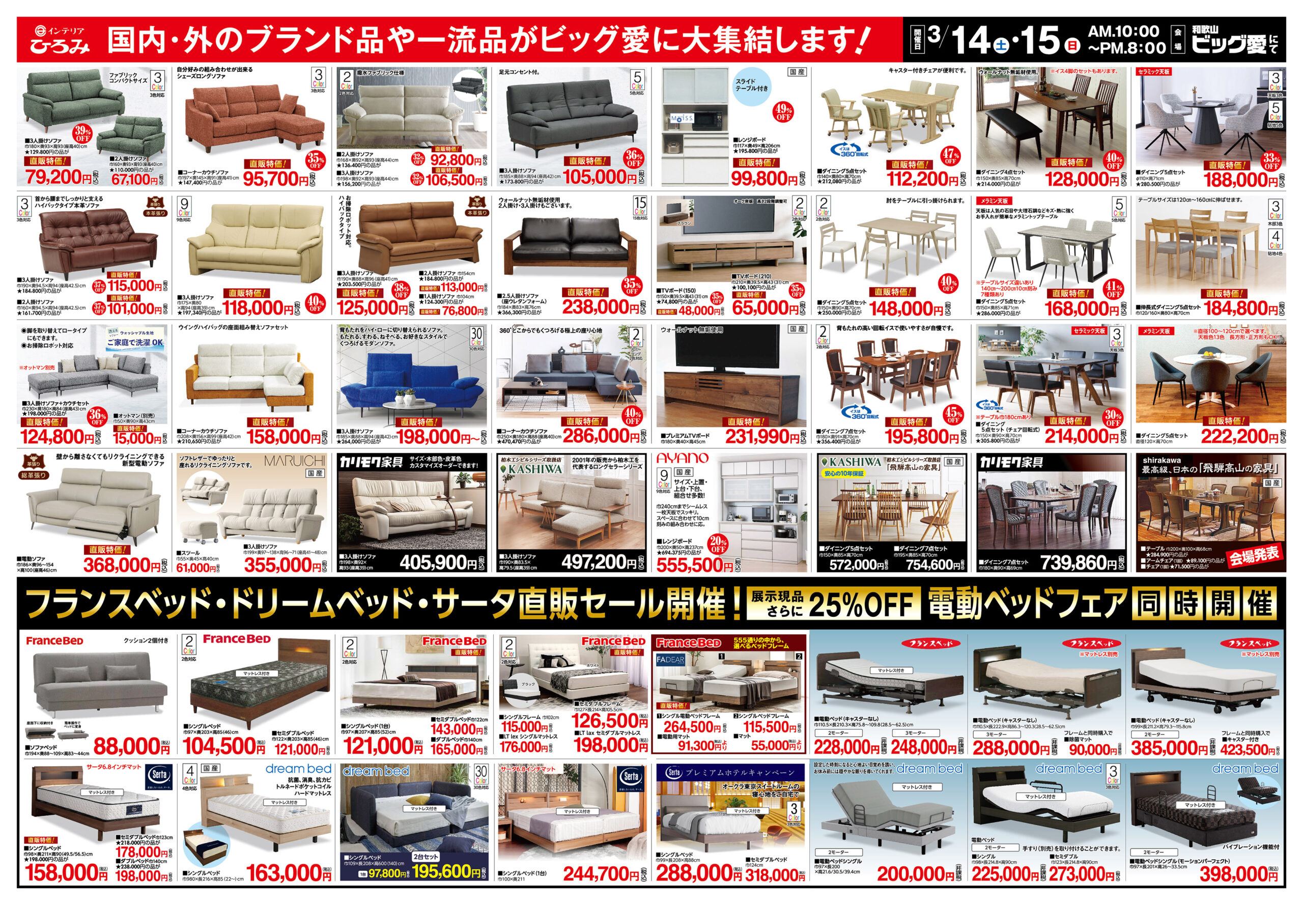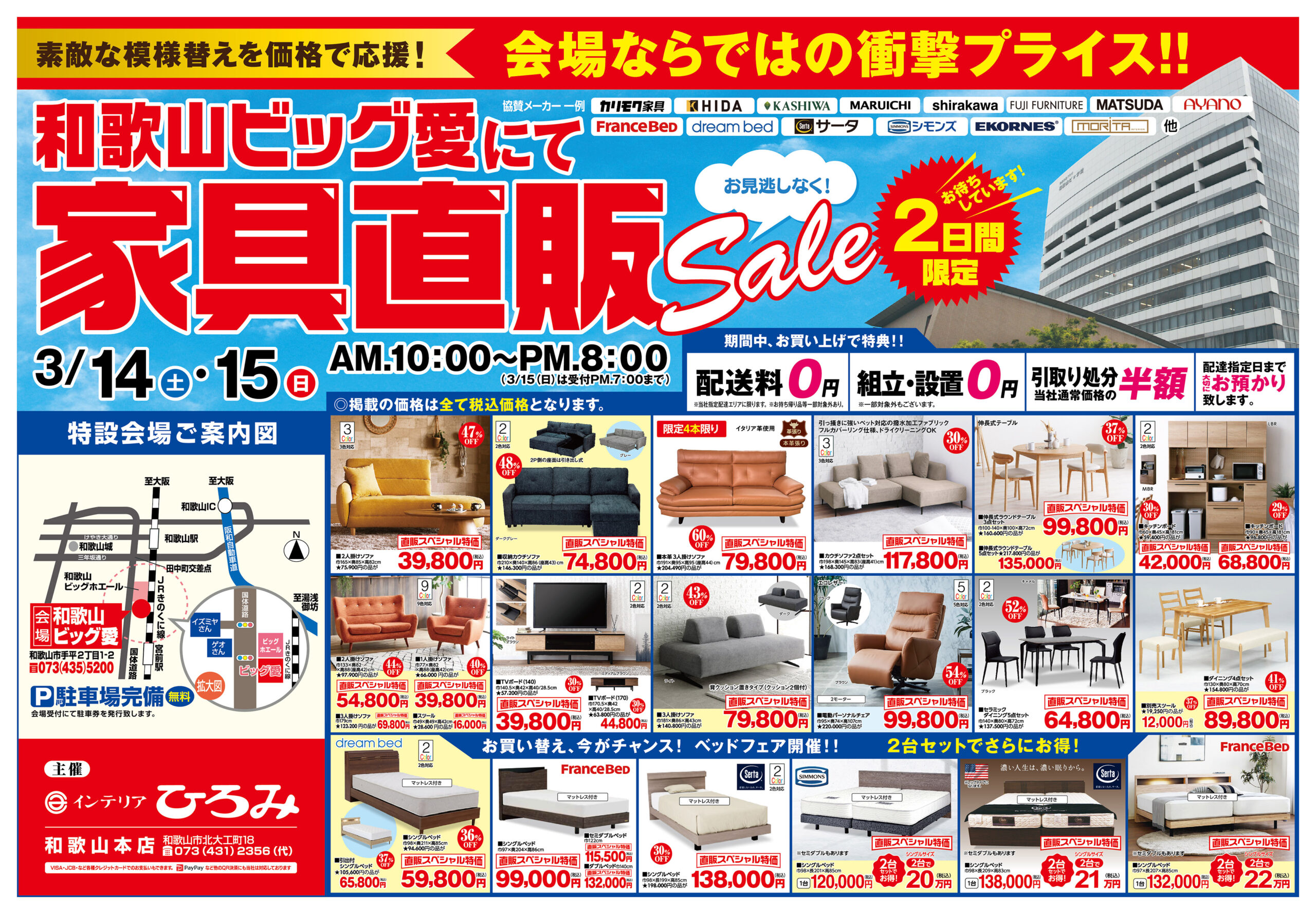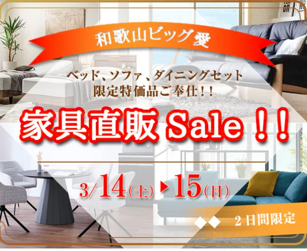 和歌山ビッグ愛 家具直販セール 3月14日(土)、15日(日)和歌山ビッグ愛、展示ホール・大ホールにて家具直販セールを開催いたします。 数多くのベッド、ソファ、ダイニングセットなどを展示いたしますので、ぜひご来場ください。 おまち申し上げます。 2026.03.07 戻る