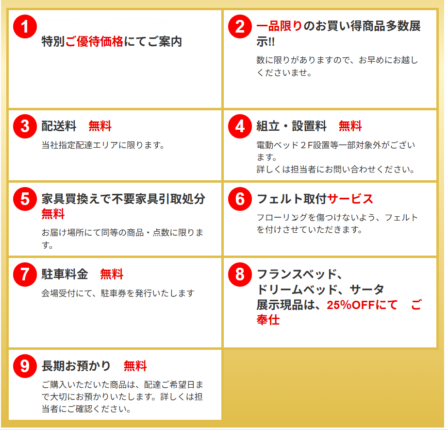 ホームページをご覧いただいてご来場の方には特典がございます。係員にお伝えください。