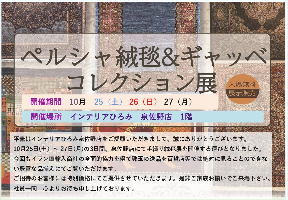お知らせ お知らせ 2025.10.19 ペルシャ絨毯&ギャッベ展 in 泉佐野店 詳しくはこちら お知らせ未分類 2025.09.17 【終了しました】和歌山ビッグ愛 家具直販セール 詳しくはこちら お知らせ未分類 2025.06.21 【終了しました】夏の模様替えフェア 7月21日まで開催 詳しくはこちら お知らせ 2025.04.17 【終了しました】4月25日~5月6日 GW特別ご優待会セール開催 詳しくはこちら お知らせ 2025.03.17 【終了いたしました】3/29(土)30(日) フランスベッド 工場直送フェアin和歌山 詳しくはこちら お知らせ 2025.02.24 【終了いたしました】和歌山ビッグ愛 家具直販セール 詳しくはこちら お知らせ 2024.12.02 【終了いたしました】ペルシャ絨毯、ギャベ コレクション展 詳しくはこちら お知らせ 2024.11.30 【終了いたしました】12月6日・7日・8日 最終売り尽くし!フランスベッド工場直送フェア 詳しくはこちら お知らせ 2024.11.02 【終了いたしました】11月16日・17日・18日 フランスベッド工場直販フェア 詳しくはこちら お知らせ 2024.10.30 【終了いたしました】ひろみ和歌山本店 大感謝祭 詳しくはこちら お知らせ 2024.09.26 【終了いたしました】10/5・6 和歌山ビッグ愛直販セール 詳しくはこちら お知らせ 2024.09.25 【終了いたしました】泉佐野店:ペルシャ絨毯・ギャッベ展を開催いたします。 詳しくはこちら 1 2 Next
